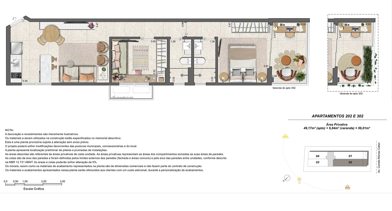 de 2 quartos com 54m² até 56m²